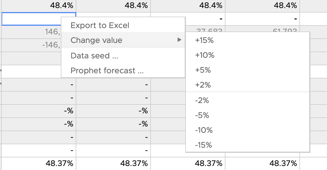If the cell contains editable data you can also get an option to change value of the cell by predefined common percentages. Remember that you can always type in the desired figure.